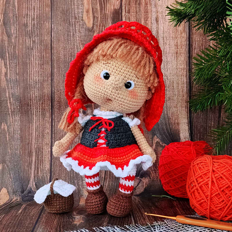 Игрушка вяжется снизу вверх, «полукрестиками», по спирали, (если не указано другое). Руки ввязываются, голова пришивается. Шапочка и корсет съёмные.